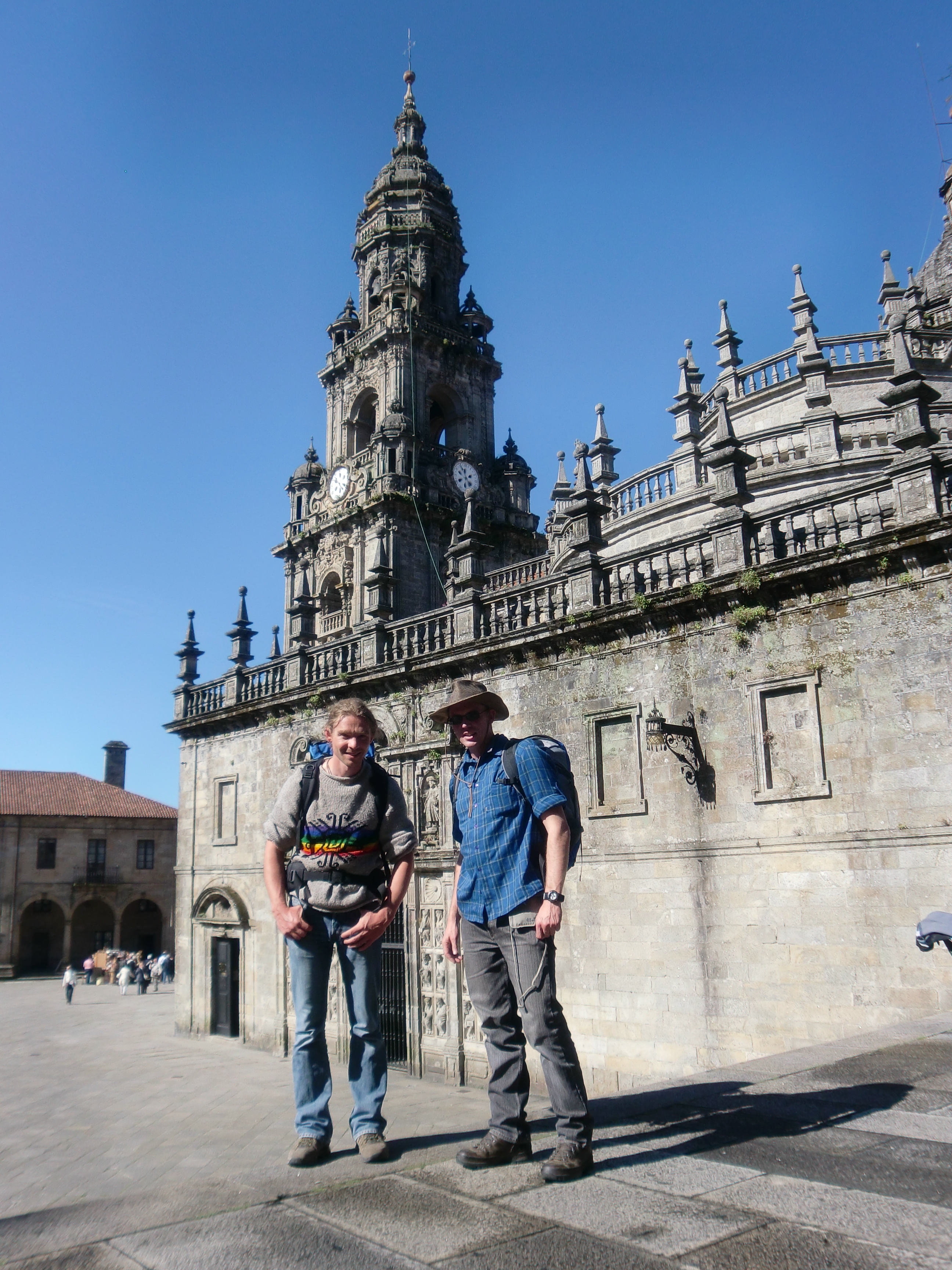 Manche Menschen behaupten, dass ich mir mitunter zu viele Gedanken mache und ja gewiss die Zeit der Untaetigkeit bewegt meine Gehirnstroeme. Fragen meines Sohnes via elektronischer Nachricht nach dem Passwort unserer FritzBox fuehren mich fuer Minuten wieder in die Heimat. Ich laufe im Schatten der Kathedrale umher, geniesse das Flair, die bekannten Gesichter der huebschen Spanierinnen in den Cafes 😉 und erfreue mich an der Freude der Pilger die heute ihren Weg beendet haben. Ein klein wenig ist das schon wie nach Hause kommen. Man hat diese Stadt und den Charme der Menschen als Caminopilger liebgewonnen. Dennoch wird es Zeit, dass wir aufbrechen. Aufbrechen zu neuen Ufern, die meine Fussabdruecke noch nicht gesehen haben. Soeben erhalte ich vom Flughafen eine SMS Carsten ist gelandet, schoen nun werden wir in wenigen Minuten wieder vereint sein und unser Navigator seinen Zeitplan der diesjaehrigen Pilgerreise vorstellen koennen. Ich schreibe Tobias in aller Kuerze wie er sein neues MacBook ins WLAN integriert und konzentriere mich jetzt wieder auf meinen Weg, der heute und sicherlich auch kuenftig nicht immer eben sein wird.