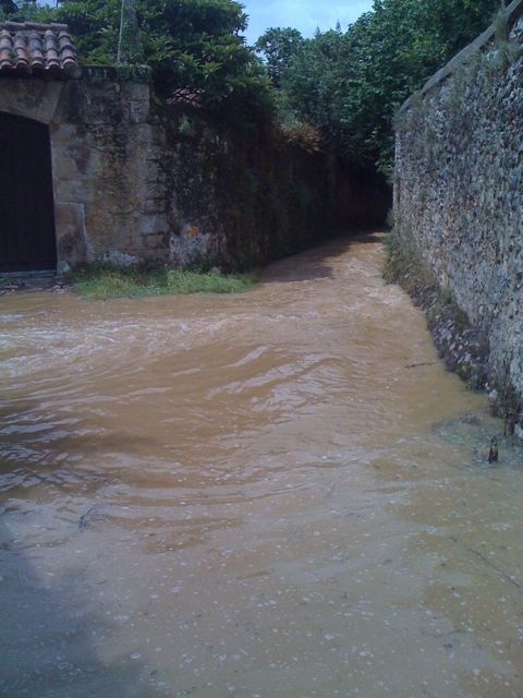 Heute schwammen dann bereits am frühen Morgen kurz hinter Santillana alle Felle weg. Mit unserer aufgeweichten Kleidung und den zentnerschweren „Botas“ sahen wir zwischen all den verwahrlosten Adelspalästen wie nasse Pinguine aus und trafen eine ebenfalls aufgeweichte Inga-Marie, die dänische Krankenschwester, die sich in den Anfangstagen dieses Caminos meines Problemfußes angenommen hatte und ihrerseits einige Tage zwischendurch passen musste. Die kantabrischen Sturzbäche verwandelten sich im Laufe des Tages in wahre Seen. Wir hätten an einigen Stellen tatsächlich sehr gut ein Schlauchboot gebrauchen können! Die beiden Fotos (s.u.) zeigen die heute nahezu unbegehbaren Abschnitte des Caminos nahe Comillas. Übermorgen erreiche ich Asturien und hier im Hostal Esmeralda versucht man mir derzeit wild gestikulierend beizubringen, dass der Camino in Asturien nicht zu passieren ist, da nahezu alle Flüsse überlaufen. Die Nachrichtensender übertreffen sich mit Live-Reportagen aus den überschwemmten Regionen. Spiele wahrhaft mit dem Gedanken, mir ein Kajak für den „Grenzübertritt“ zu beschaffen und lasse aus Sicherheitsgründen die Camino-Neupilgerin am Donnerstag nach Deutschland zurückfliegen.