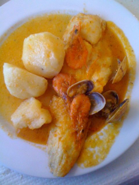 Gutes Essen ist auf dem Camino unabdingbar. Ich wurde heute bereits gegen 16:15 Uhr von der galicischen Küche verwöhnt. Merluza a la Marinera garniert mit ein paar Muscheln, Gambas und Salzkartoffeln. Lecker!