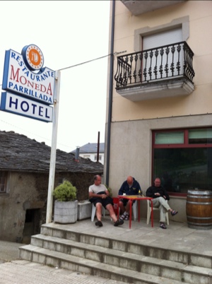 Um 18:00 Uhr war die heutige Pilgermesse für uns gelesen! Wir kamen mit den letzten Kraftstoffreserven in dem 30 km vor Lugo gelegenen Cádavo-Baleira an. Für die Herberge waren wir nach 8,5 Std. Wanderung und zurückgelegten 25 Kilometern allerdings zu spät dran. Completo. Völlig unverständlich da wir ja tagelang kaum Pilger auf der Piste gesehen hatten. Offensichtlich haben wir die eine oder andere Pilgerseele auf dem Weg von Oviedo eingeholt. Die Gesichter der in der Herberge befindlichen Pilger hatten wir nämlich zuvor nie gesehen. Endlich mal ein wahres Alibi für die Übernachtung in der Pension. Zur Feier des Tages haben wir dann im „besten“ 1 Sterne Tempel des Ortes im „Hotel Monedo“ eingecheckt. Zu unserer Ehrenrettung sei ergänzt: Es gibt nur ein Hotel in diesem überaus beschaulichen Ort und das schöne Doppelzimmer mit Badewanne und Shampoo kostet uns lediglich 38,00 €. Ein bezahlbares Vergnügen wie so vieles hier in Galicien. Während ich diese Zeilen vor dem Abendessen schreibe schnarcht Rigo bereits im Zimmer. Aus der in Aussicht gestellten harmloseren Etappe wurde nochmals eine Härteprüfung, da es galt weitere zwei Hügel (936 m) zu überwinden. Irgendwie muß der Autor unseres Outdoor-Reiseführers (erneut keine Empfehlung an dieser Stelle!) einen anderen Weg als den beschriebenen gegangen zu sein. Wie anders kann er bei zwei extremen Steigungen von „kleineren Herausforderungen“ sprechen. Zumindest der erste steile und steinige Aufstieg nach „A Lastra“ ist mörderisch! Nach dem Aufstieg auf den Pass „Alto de Fontaneira“ hatte ich dann wirklich die Kette ab und huschte den letzten Abstieg kurzerhand auf den Freizeitschluppen herunter. Rigo blieb in seinen Stiefeln. Dafür meldete sich leider auch sein zweites Schienbein bei der ersten kleineren Herausforderung ….