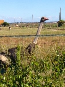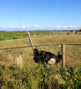 Bei wolkenlosem Himmel durchwanderten wir völlig konträr zum gestrigen Tage Felder, Acker und Weinbaugebiete. Neugierige Straußenvögel