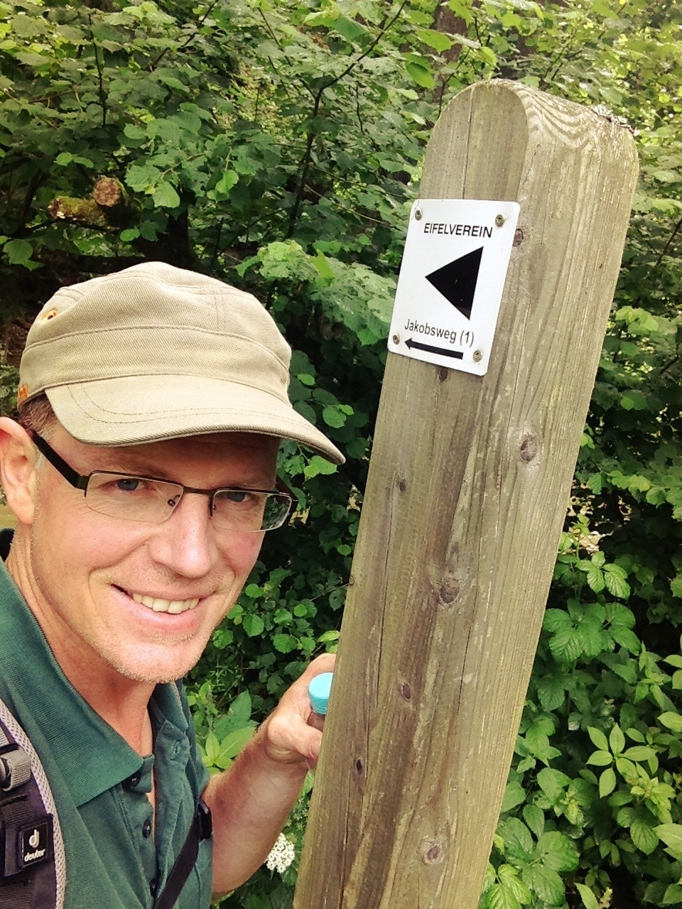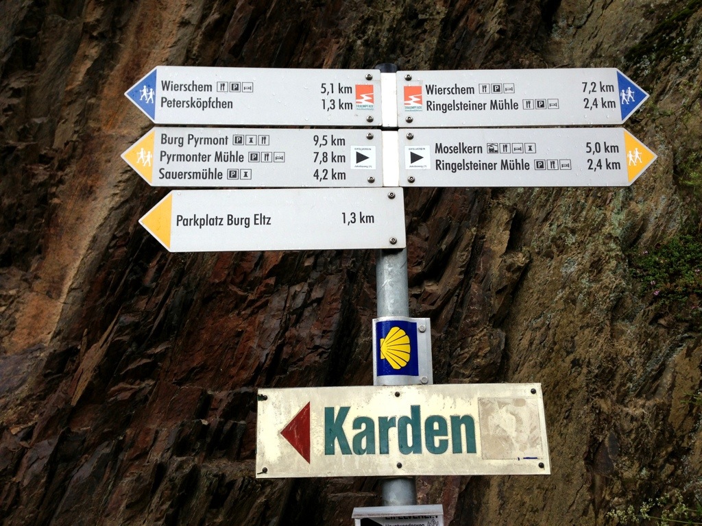 Doch wie definiert MANN „ganz ganz lange Zeit“? Um es genau zu nehmen, genau drei Tage lang!!! Und schwupps da bin ich wieder auf dem Jakobsweg unterwegs. Völlig unbeabsichtigt wie ich an dieser Stelle gerne betonen darf. Es waren heute 10.000 höchst abwechslungsreiche Meter auf dem Jakobsweg von der Burg Pyrmont zur Burg Eltz. 2 1/2 Stunden unterwegs in reinster Natur entlang eines Gewässers in Moselnähe. Eine Strecke die selbstredend sehr positiv in meine persönliche Jakobsweg-Statistik eingehen wird. Meiner „Mitpilgerin“ Lidka hat es übrigens auch sehr gut gefallen. Mit Ausnahme des Wolkenbruches bei Kilometer 7 einhalb …. . Mir persönlich hat dieses wetterbedingte Ereignis nichts ausgemacht. Wer galicisches Wasser von oben kennt lacht über Eifeler Nässe an einem wettermäßig ansonsten durchwachsenen Juni-Tag.