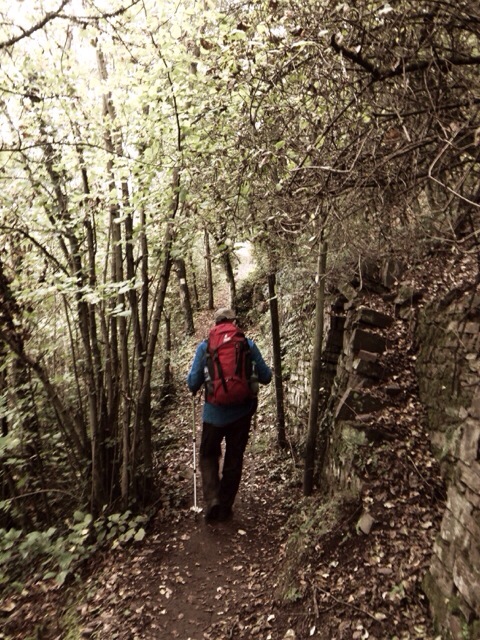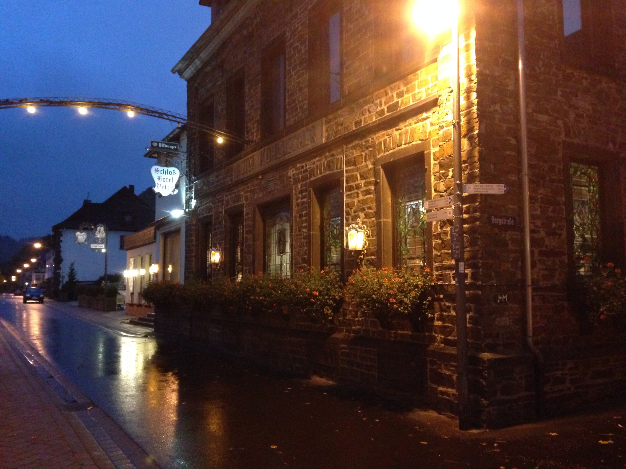 Die Ruhe vor dem Sturm, wie sich später allerdings herausstellen sollte. Auf den Eifeler Höhen rund um die Burg Eltz gingen uns gegen Mittag dann in der Tat Kappen und Hüte fliegen. Vom Winde verweht, leicht durchnässt, trudelten wir dann nach weiteren 20 Kilometern in Treis-Karden ein und tauschten das HD-TV ausgestattete Luxuseinzelzimmer in Alken mit einem eher bescheidenen Pilgerdoppelzimmer im Keller eines Wohnhauses gleich neben dem Heizölraum. Bei einem Blick aus dem Kellerfenster sind dennoch Demut und Dankbarkeit angesagt, schließlich haben wir ein Dach über dem Kopf… .