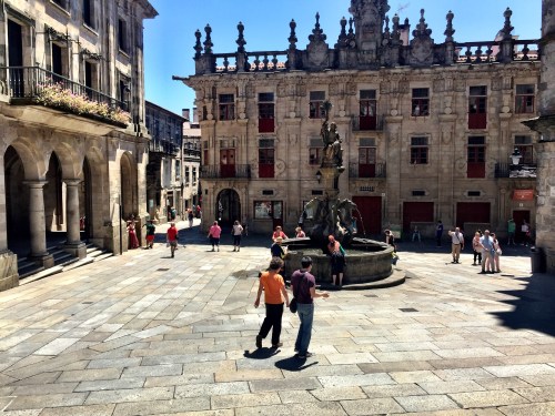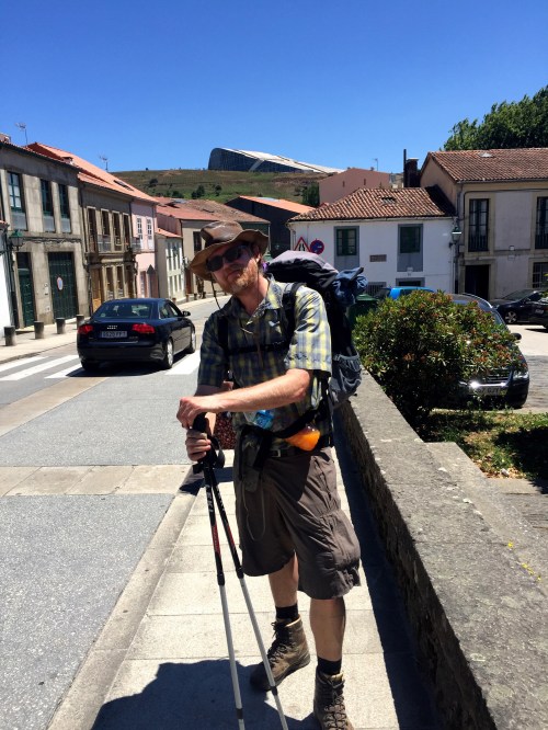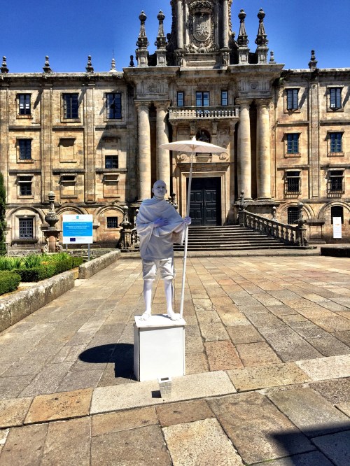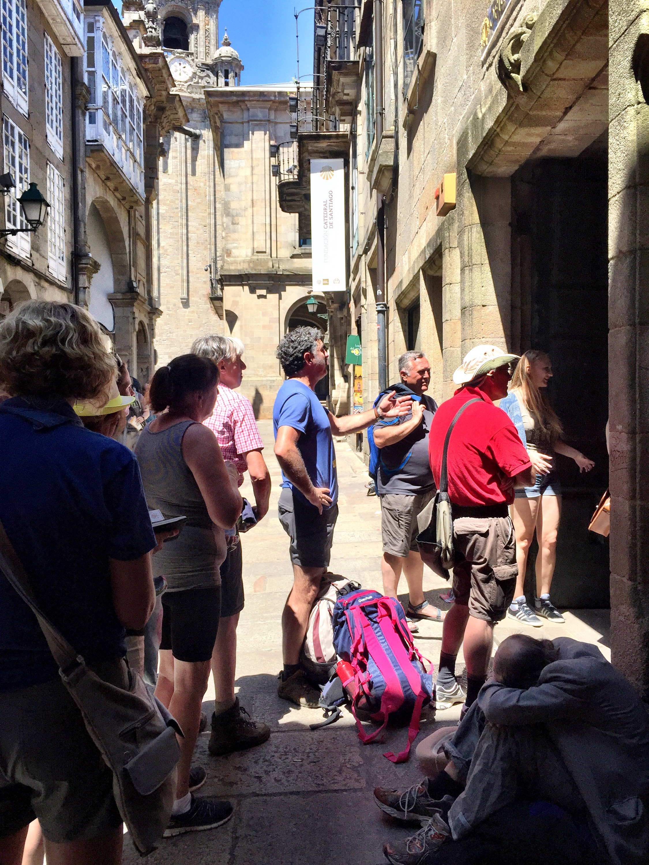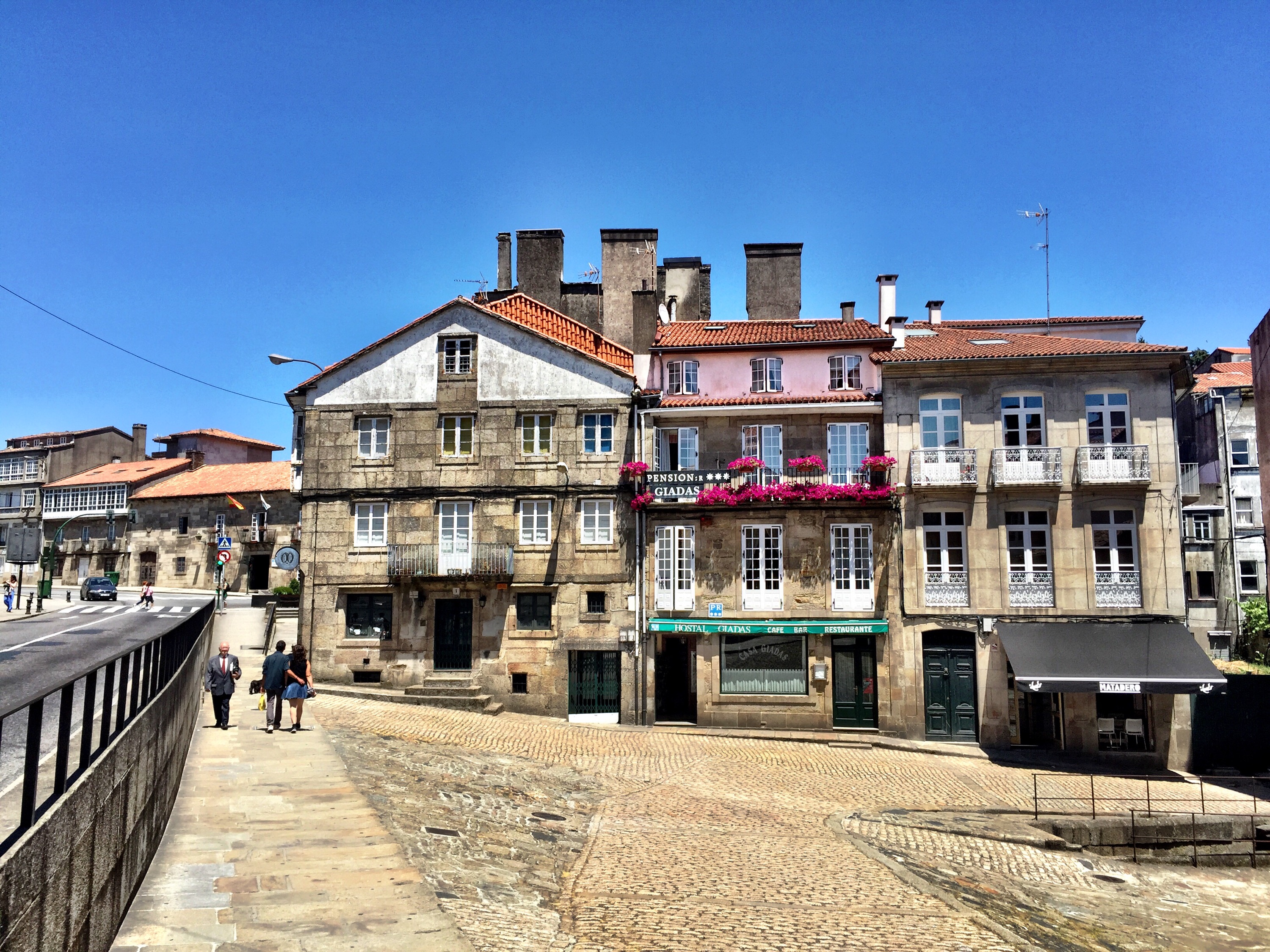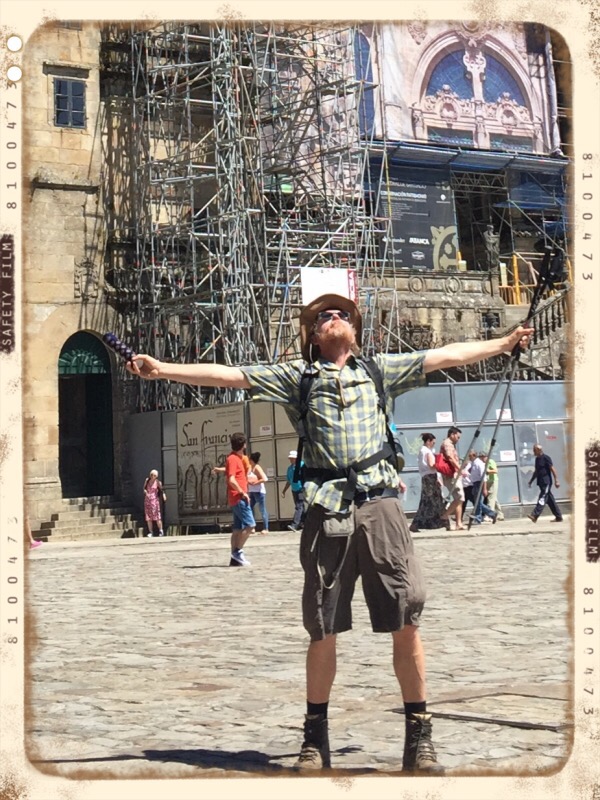 Das war er nun also, mein Camino de Madrid/ Camino Sanabrés/Camino Sureste, zusammenfassend besser gesagt, meine 690 km auf dem 2015er Camino de Santiago. Bei all den Wegbezeichnungen hab ich selbst so manches Mal den Durchblick verloren. Bedingt durch meine individuelle Streckenplanung ergab es sich eben so und nicht anderes. Wenn man es genau nimmt, bin ich am Schlußtag sogar noch ein paar hundert Meter auf dem Camino Frances gepilgert. All diese genannten Wege/Caminos verlaufen ja sternenförmig in Richtung Santiago de Compostela und treffen spätestens an der Kathedrale von Santiago aufeinander. Ich weiß nicht, ob es an der Magnesiumzufuhr der letzten Tage, meinem Ingwerkonsum, oder in letzter Instanz einfach nur am Adrenalin gelegen hat. Ich schien an diesem Tag förmlich nach Santiago fliegen zu wollen. Nach lediglich 8 Stunden Wanderung erreichte ich auf einer erneut anspruchsvollen, „hügeligen“ Etappe mein Pilgerziel. Ein Novum war dabei, dass ich bis zum Zentrum der Stadt keinen einzigen Fußpilger zu Gesichte bekam. Lediglich 2 Fahrradpilger kreuzten meinen Weg. In der Stadt verließ ich den Camino völlig untypisch gen Norden in Richtung Busbahnhof. Wollte ich etwa Santiago de Compostela sofort wieder verlassen, wo ich doch 25 Tage hart dafür geackert hatte, hier überhaupt anzukommen? Nein, Grund für meinen erneuten „Spurwechsel“ war meine beabsichtigte heutige Weiterfahrt nach … Porto. Ich hatte noch kein Ticket in der Tasche und wollte an einem sonnenüberfluteten Wochenende nicht riskieren, kein Ticket Meer zu ergattern. Porto, einfaches Ticket, 33€, Abfahrt 20.06.15 17:00 Uhr – bingo! Nachdem das begehrte Objekt in meinem Rucksack verstaut war, geriet ich in der Tat dann in den Genuß noch wenige hundert Meter auf der Zielkurve des Hauptweges, des Camino Frances, einzulaufen. In der Stadt selbst wimmelte es bei herrlichem Sonnenwetter vor Menschen. Ganze Bienenschwärme von Pilgern schienen alle Wege und Plätze eingenommen zu haben. Für mich war das alles sehr verstörend. War ich doch so häufig Alleinunterhalter auf meinem 2015er Camino und konnte mit den plötzlichen Menschenmassen in der Stadt rein gar nichts anfangen, vielleicht auch, weil ich kein einziges bekanntes Gesicht unter ihnen entdecken konnte.