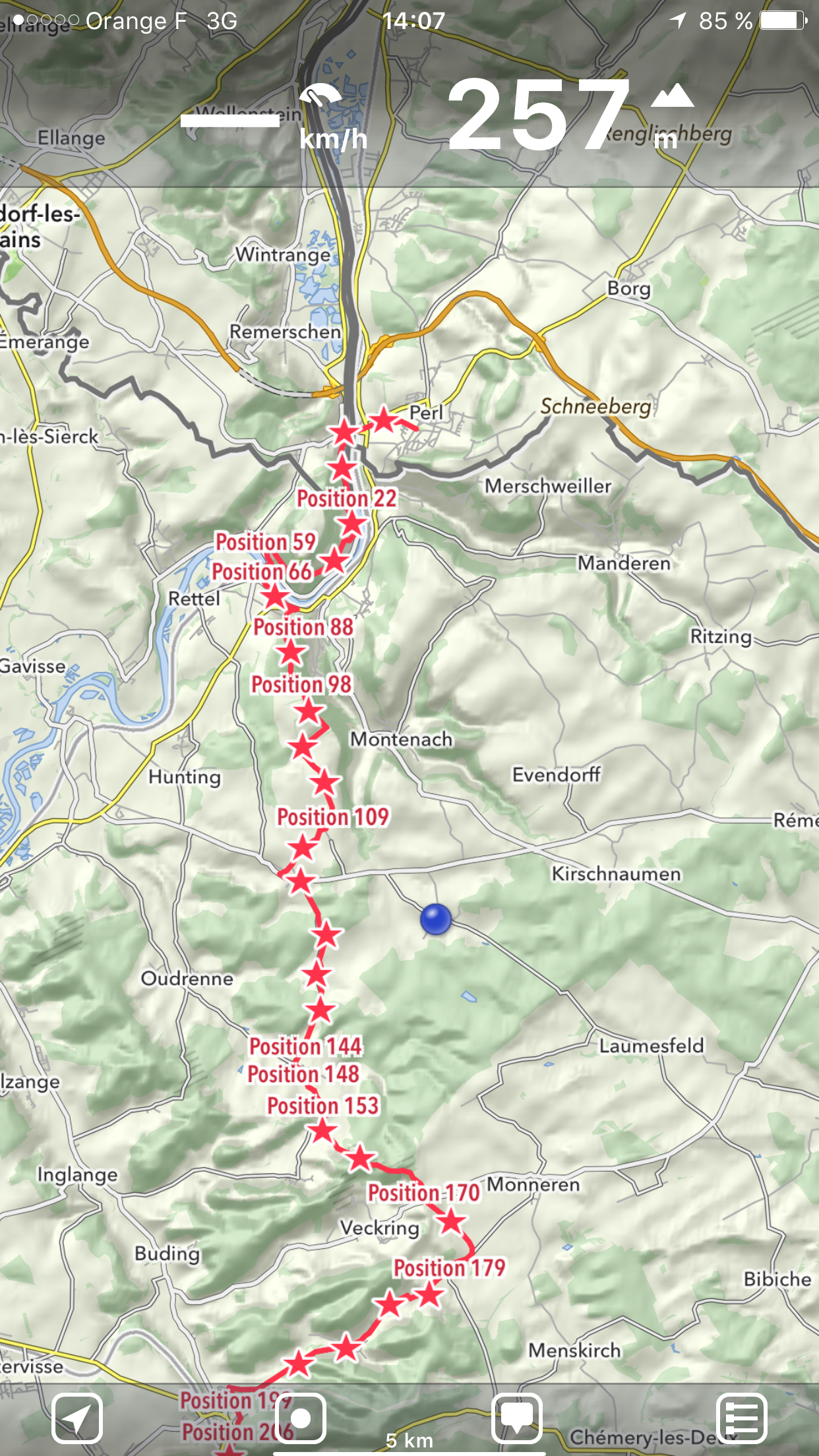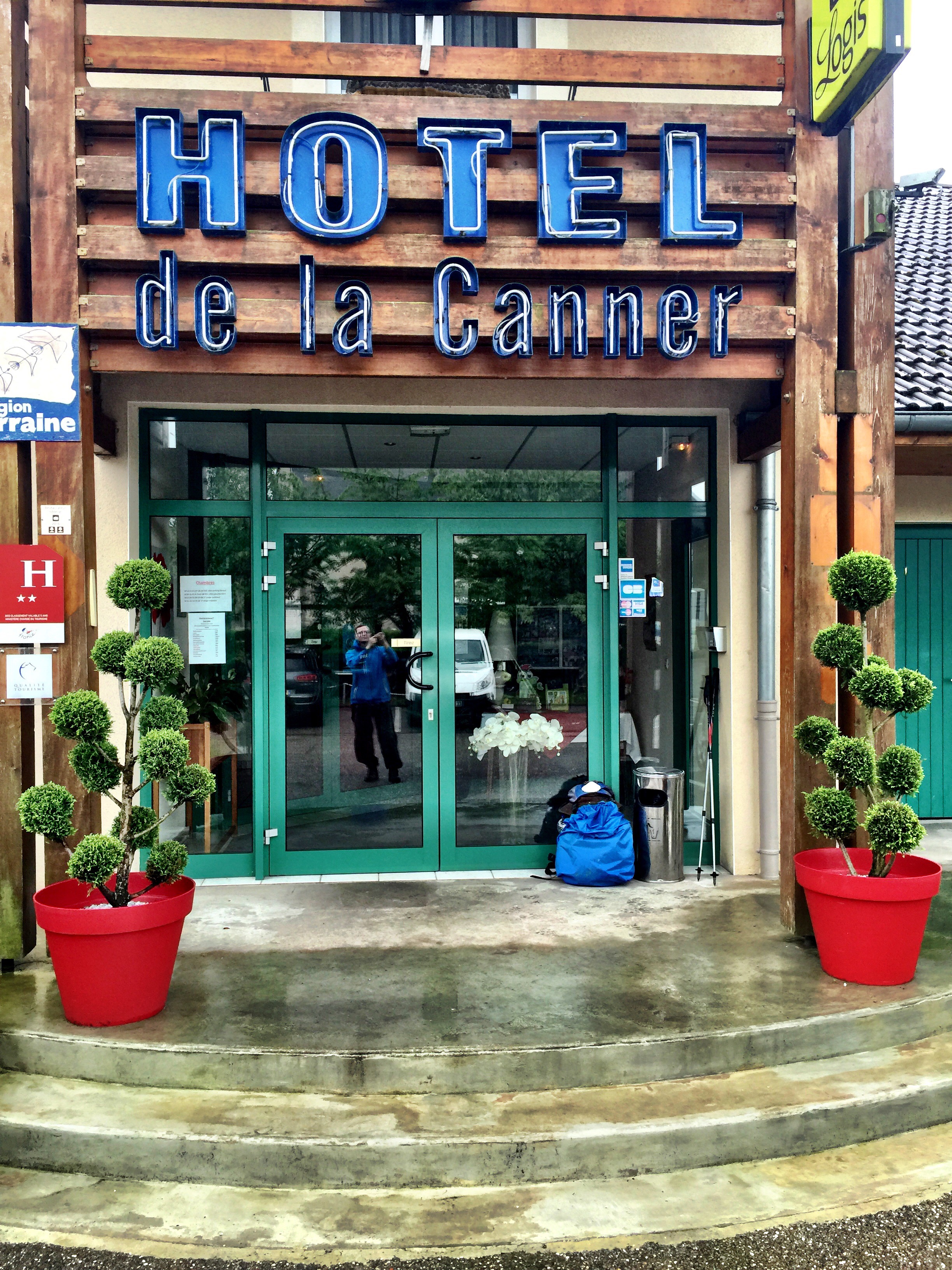 Mein Standort (blaue Kugel) wich stets kilometerweit vom eigentlichen Weg ab. Die Orte „Montenach“ und „Monneren“ hätte ich beispielsweise nach der originären Streckenbeschreibung gar nicht sehen dürfen. Unter dem Strich dürfte ich wieder einmal ein paar Ehrenkilometer mehr absolviert haben. Letztendlich habe ich es ja doch noch bis Kédange sur Canner geschafft und lass es mir in der einzigen Übernachtungsmöglichkeit im Ort gut gehen. Hoffentlich sind bis morgen früh wieder alle Sachen (einschließlich der Bahntickets für die Rückfahrt am Sonntag) trocken!
