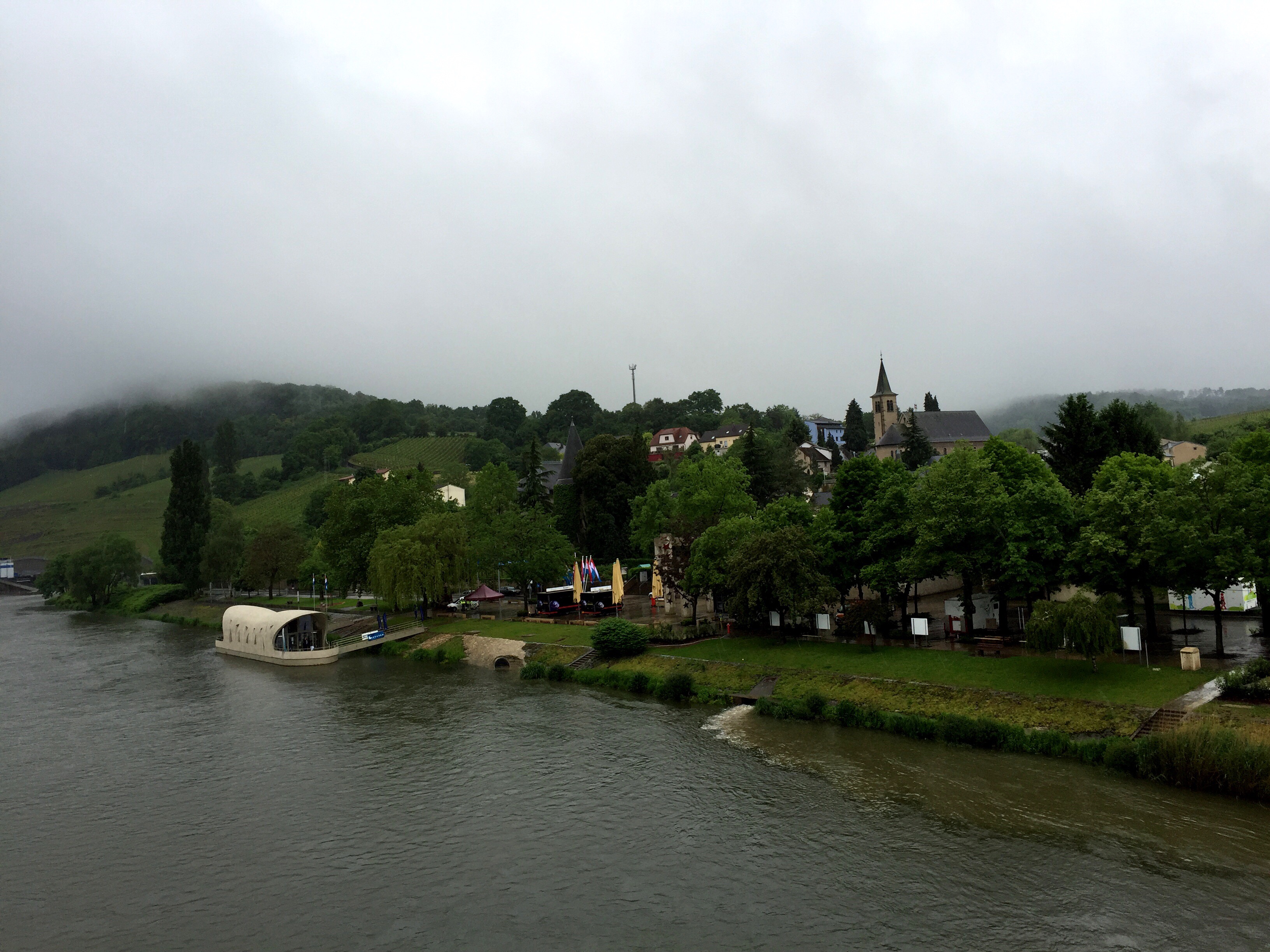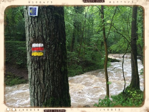 Es schüttete vom ersten Schritt aus dem Pfeiferschen Haus heraus wie aus Kübeln und schon bald merkte ich, dass Regenhose und Regenjacke bzw. auch die schicke Deuter Rucksackhülle heute ihren Härtetest ablegen sollten. Ich nehme es vorweg, am Ende des Tages war nahezu alles durchweicht. Selbst meine Lowa-Stiefel verloren in der 8-stündigen Regenwanderung heftig an Form und waren schwer wie Blei. Eine weitere Erkenntnis war die, dass ich mit meinen offensichtlich veralteten Wanderkarten auf dem iPhone auf diesem Kurzcamino keinen Blumentopf gewinnen kann. Ich irrte anfangs in den Schengener Weinbergen umher und fand zunächst den Weg aus dem Weinberg nicht mehr heraus. Und endlich in Frankreich angekommen, stellte ich zu meiner Überraschung erneut fest, dass sich die Beschilderung nicht im Einklang mit meiner gpx-Datei befand.