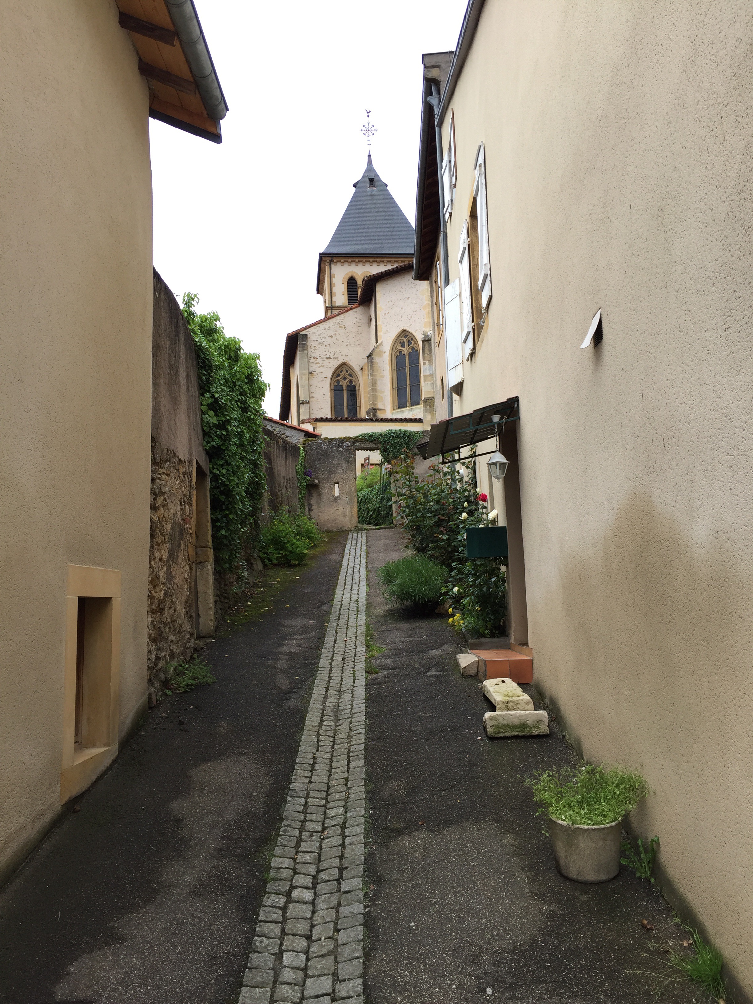 Den frühen Morgen verbrachte ich schlendernd mit einer Sightseeing-Tour durch Metz. Bei ausgesprochen angenehmer Witterung und Sonnenschein merkte ich bald, dass dieser Tag nicht dazu angetan war sportive Pilgerhelden zu zeugen. Von den Belastungen der beiden Vortage war mein alternder Körper gezeichnet und signalisierte mir, heute eine besonders kurze Etappe aufs Parkett zu legen. Einmal aus der Stadt heraus kommend, war wieder einmal die geliebte Moselle meine Begleiterin. Irgendwann ging es dann von der Mosel weg in die Weinberge, auf einen Weinpfad und anschließend auch wieder in ein aufgeweichtes Waldgelände. Weinberge scheinen in diesem Jahr irgendwie nicht meine Stärke zu sein. Vielleicht lags ja auch an den Chemikalien die Herr Winzer massenweise auf die Rebstöcke pustete. Ich wurde trotz der geringen Laufstrecke müde und beschloss im „größten“ Ort auf der heutigen Etappe zu nächtigen. Im Gegensatz zu den ersten 4 Übernachtungen hatte ich für heute ja noch kein Bett vorab gebucht und war mithin in meiner Entscheidungsfindung völlig vogelfrei. Ancy sur Moselle hieß das Dorf meiner Wahl, zunächst leider aber ohne Übernachtungsmöglichkeit. Gleichwohl dieser Ort auf dem aktuellen Wegeplan seine Camino-Zugehörigkeit verloren hat, fand ich Gefallen an ihm und wollte ein Weiterlaufen unbedingt umgehen. Zum Glück fiel ich Jean-Luc in die Hände, der mich aufs „Mairie“ schleppte.