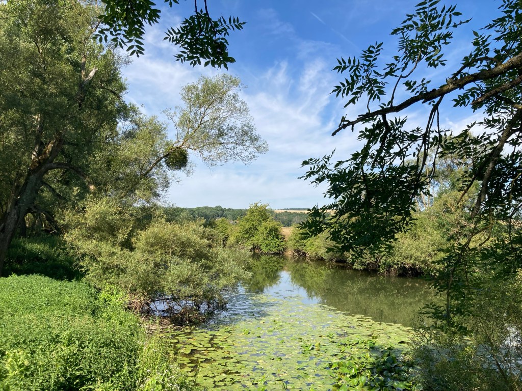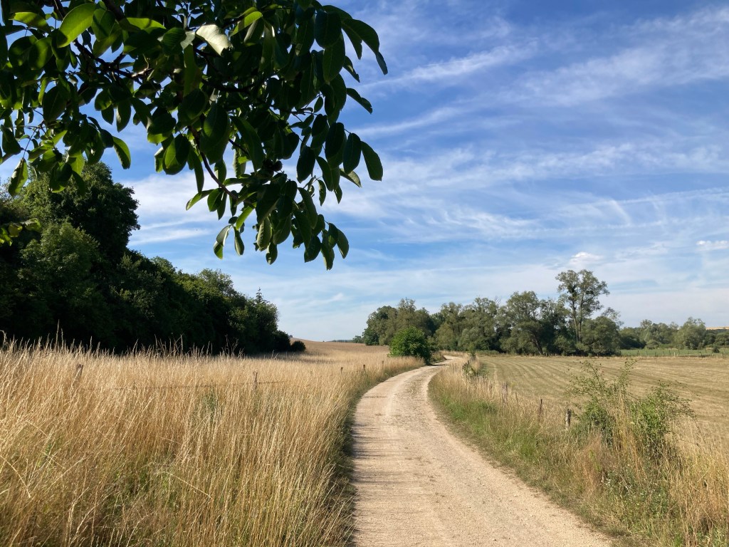 Den heutigen sonnenverwöhnten Tag pilgerte ich überwiegend entlang des wohl größten Kornanbaugebiets Ost-Frankreichs. Landwirtschaftliche Erntemaschinen waren unentwegt im Einsatz um die Ernte gebündelt einzufahren und auch ich wurde kurzfristig zum „Erntehelfer“. Den traditionellen Versorgungsengpass zur Mittagszeit wollte ich heute nicht so einfach hinnehmen und erlaubte mir kurzerhand bei der „Zucchini-Ernte“ mit anzupacken. Folgerichtig gabs dann für mich ein wahren Leckerbissen zum Mittagessen: Zucchini-Burger, rohe Zucchini im goldgebackenen Baguette ummantelt.