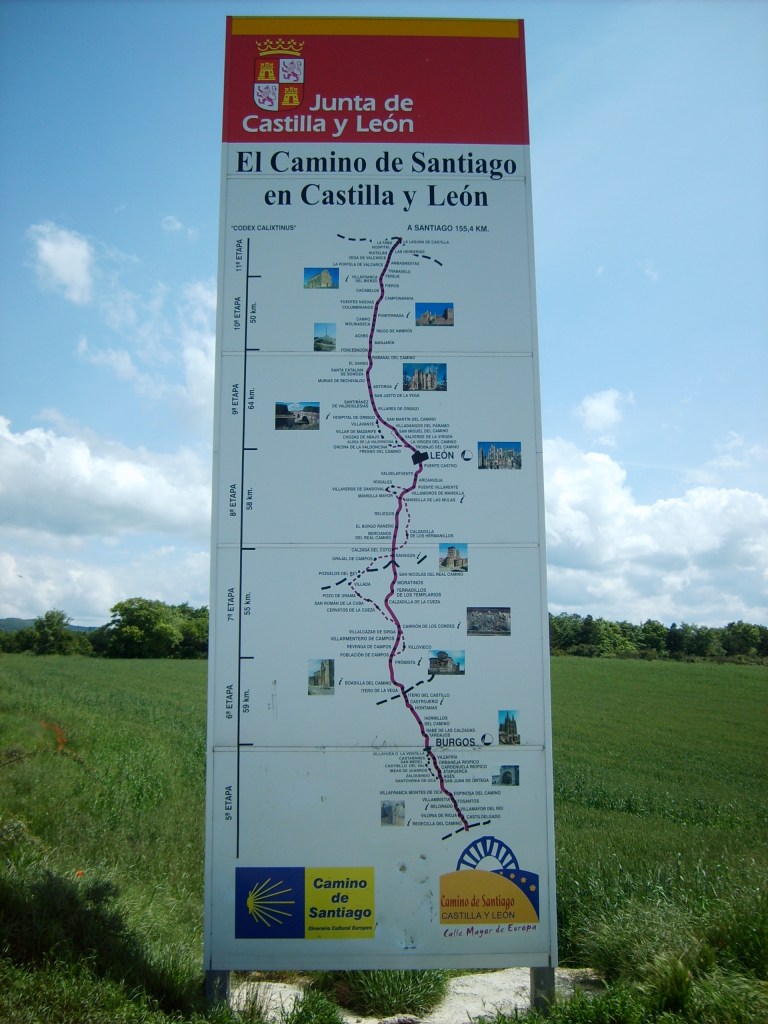 Wir legen regelmäßig Pausen ein und genießen die Kommunikation mit Pilgern aus allen Erdteilen dieser Welt. In zwei Tagen erreichen wir nach längerer Zeit wieder eine größere Stadt. BURGOS! Heute haben wir übrigens zum ersten Mal kein Bett in der Pilgerherberge in Redecilla del Camino bekommen. Wir waren einfach „zu spät dran!“ Alles ausgebucht, freundliche Spanierinnen haben den erschöpften Pilgern ersatzweise eine Notunterkunft im Gemeindehaus eingerichtet. Nun schlafen wir auf dem Boden. Streiche komfortabele Schlaraffia-Matratze, setze Kartonage und Teppichbodenreste!