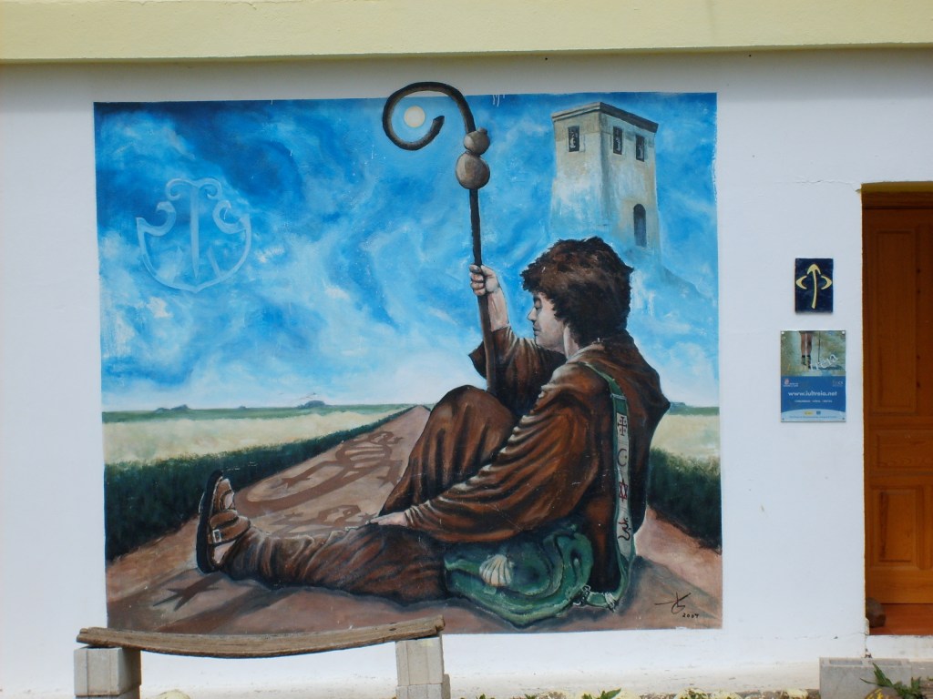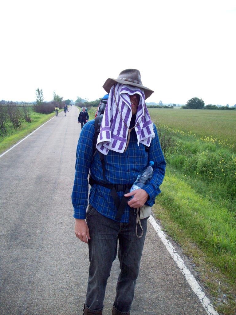 Man hätte beim Anblick dieser menschlichen Gestalten eher von Tropenforschern als von Mitpilgern ausgehen können! Ich hingegen entschied mich für eine alternative Abwehr der Mückenplage und streifte mir das, auf diesem Camino käuflich erworbene, lila-weiße Baumwollhandtuch über den Kopf und setzte auf dieses zur besseren Befestigung zusätzlich noch den Lederhut auf.