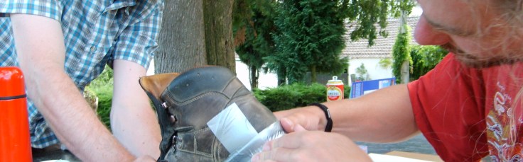 Silbernes gewebebandverstärktes „Panzertape“ wurde großflächig um beide Schuhsohlen der Wanderschuhe gewickelt und soll, der Werbung nach zu urteilen, „speziell auf die enorm hohen Anforderungen im Outdoor-Einsatz konzipiert sein und dabei über eine sehr gute Reißfestigkeit in Quer- und auch Längsrichtung verfügen“. Aha!